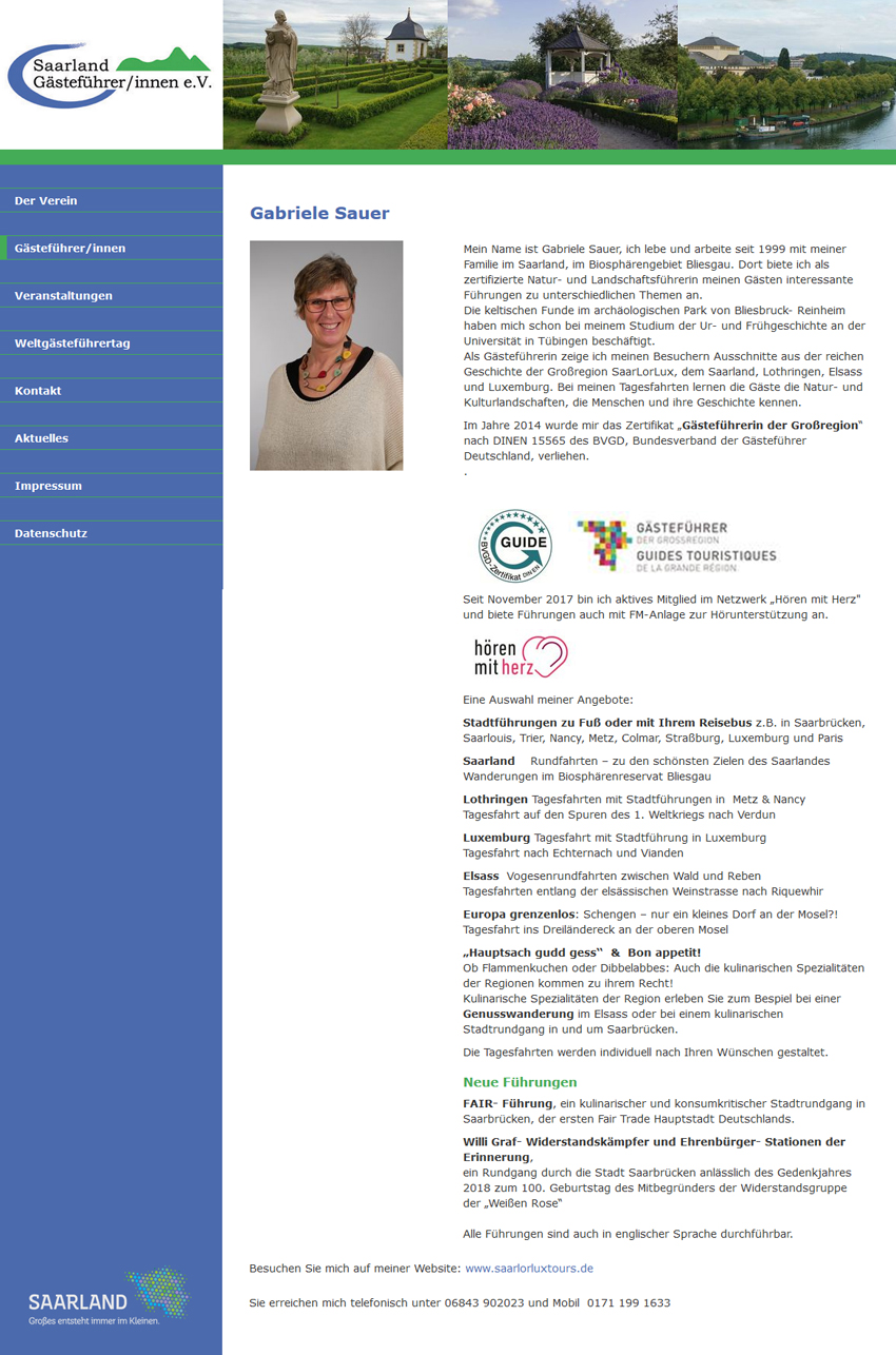 Schön, dass Sie da sind! Mein Name ist Gabriele Sauer und ich lebe seit 1999 mit meiner Familie im Saarland, mitten im UNESCO-Biosphärenreservat Bliesgau. Dort biete ich als geprüfte Natur- und Landschaftsführerin interessante und unterhaltsame Exkursionen zu unterschiedlichen Themen an. Als zertifizierte Gästeführerin der Großregion nehme Ich biete Ihnen neben einer kompetenten Reiseleitung und Busbegleitung auch ortskundige Stadtführungen sowie geführte Wanderungen an. Menschen mit besonderen Bedürfnissen liegen mir dabei besonders am Herzen! Ich berate Sie gerne – Rufen Sie einfach an SaarLorLuxTours |